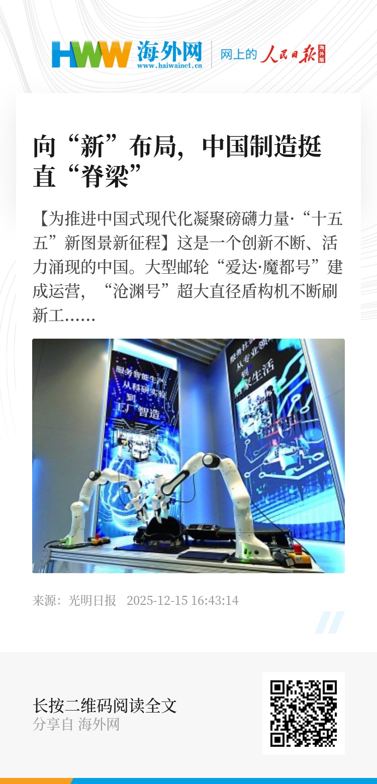 “十五五”即将开启。变局蕴含机遇,挑战激发斗志。正如专家所说,集中力量办好自己的事,始终坚守主业、做强实业、做精专业,以先进制造业为骨干的现代化产业体系必将加快构建,实体经济根基必将进一步巩固壮大,为以中国式现代化全面推进强国建设、民族复兴伟业提供坚实物质支撑。(光明日报记者 刘坤)