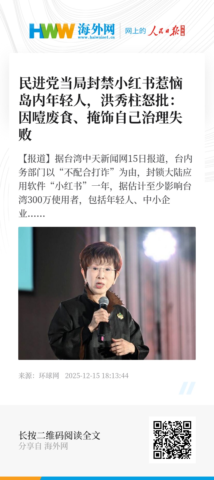 【环球网报道】据台湾中天新闻网15日报道,台内务部门以“不配合打诈”为由,封锁大陆应用软件“小红书”一年,据估计至少影响台湾300万使用者,包括年轻人、中小企业皆受影响,引发争议。国民党前主席洪秀柱15日怒批民进党当局因噎废食,诈骗不抓,封禁青年社交平台,是在掩饰自己的治理失败、治安崩盘、“执政”无能。