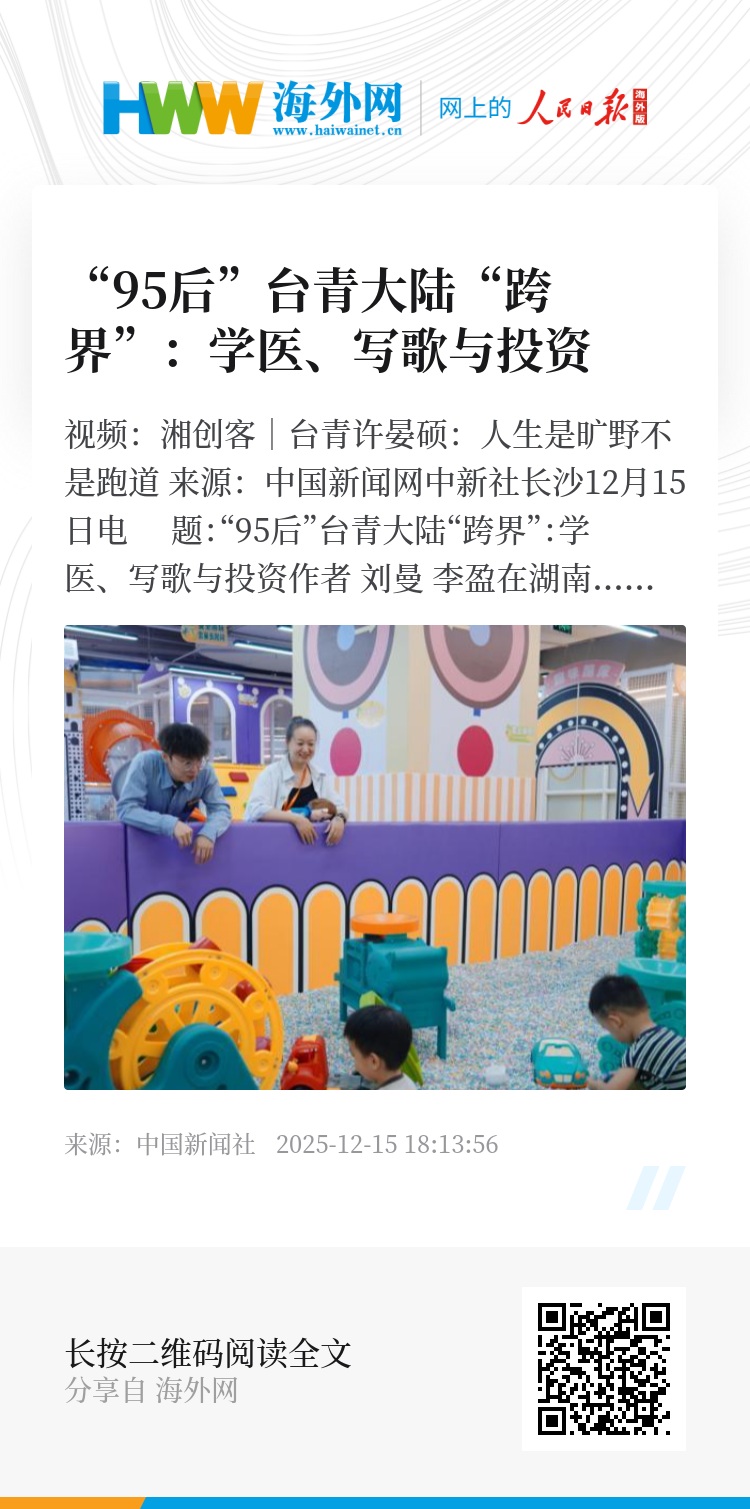 中新社长沙12月15日电 题:“95后”台青大陆“跨界”:学医、写歌与投资