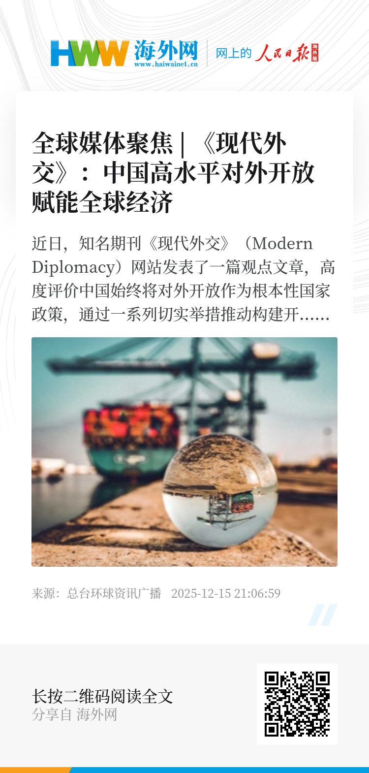 近日,知名期刊《现代外交》(Modern Diplomacy)网站发表了一篇观点文章,高度评价中国始终将对外开放作为根本性国家政策,通过一系列切实举措推动构建开放型全球经济,为全球经济发展作出卓越贡献。