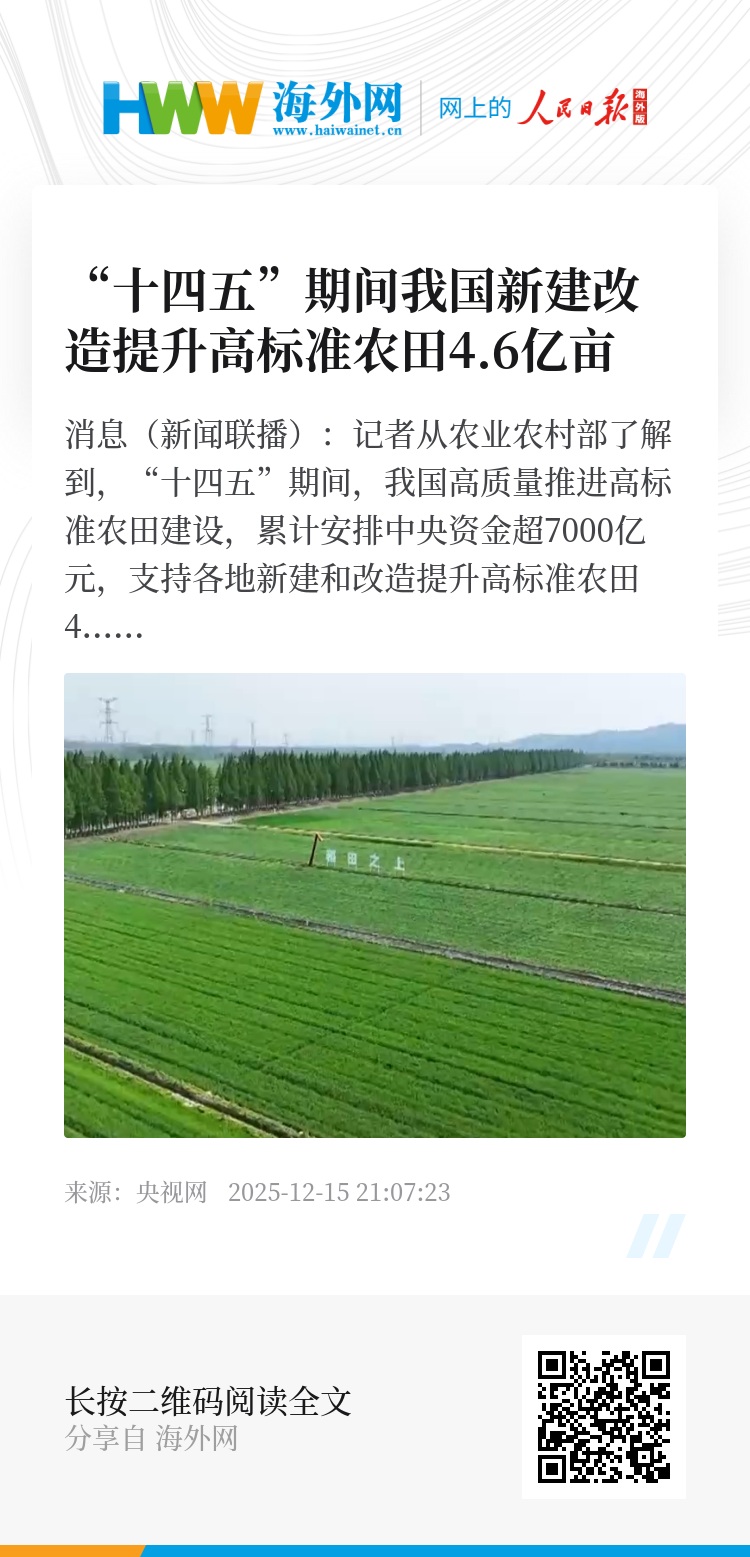 央视网消息(新闻联播):记者从农业农村部了解到,“十四五”期间,我国高质量推进高标准农田建设,累计安排中央资金超7000亿元,支持各地新建和改造提升高标准农田4.6亿亩。