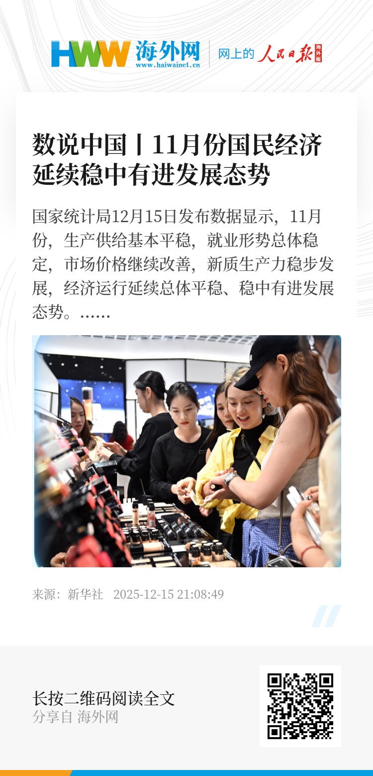 国家统计局12月15日发布数据显示,11月份,生产供给基本平稳,就业形势总体稳定,市场价格继续改善,新质生产力稳步发展,经济运行延续总体平稳、稳中有进发展态势。