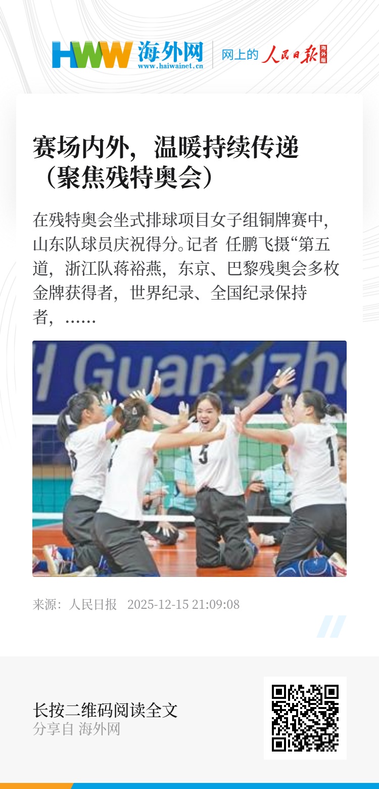 赛场内外,温暖持续传递。身着青绿色义工服装,坐着轮椅的香港姑娘林渲甯笑容甜美,熟练地进行票务检查和引导服务。“很荣幸能参与志愿工作。作为残障人士,我能更敏锐地捕捉到运动员的需求和情绪,并主动提供帮助。”林渲甯说,“看到他们在赛场上奋力拼搏,我的内心也更有力量。”