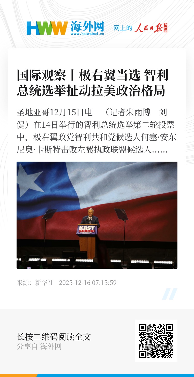 分析人士指出,卡斯特胜选缘于其竞选主张契合选民核心关切,但在智利社会经济多重困境叠加的背景下,其执政之路充满挑战。同时,这一结果也再度印证当前拉美政治格局向右转的趋势。