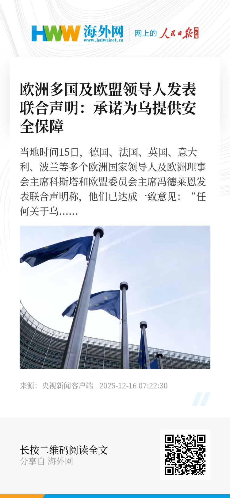 当地时间15日,德国、法国、英国、意大利、波兰等多个欧洲国家领导人及欧洲理事会主席科斯塔和欧盟委员会主席冯德莱恩发表联合声明称,他们已达成一致意见:“任何关于乌克兰可能做出领土让步的决定,只有在强有力的安全保障措施到位之后才能作出——这些安全保障应包括一支由欧洲主导的多国部队”。
