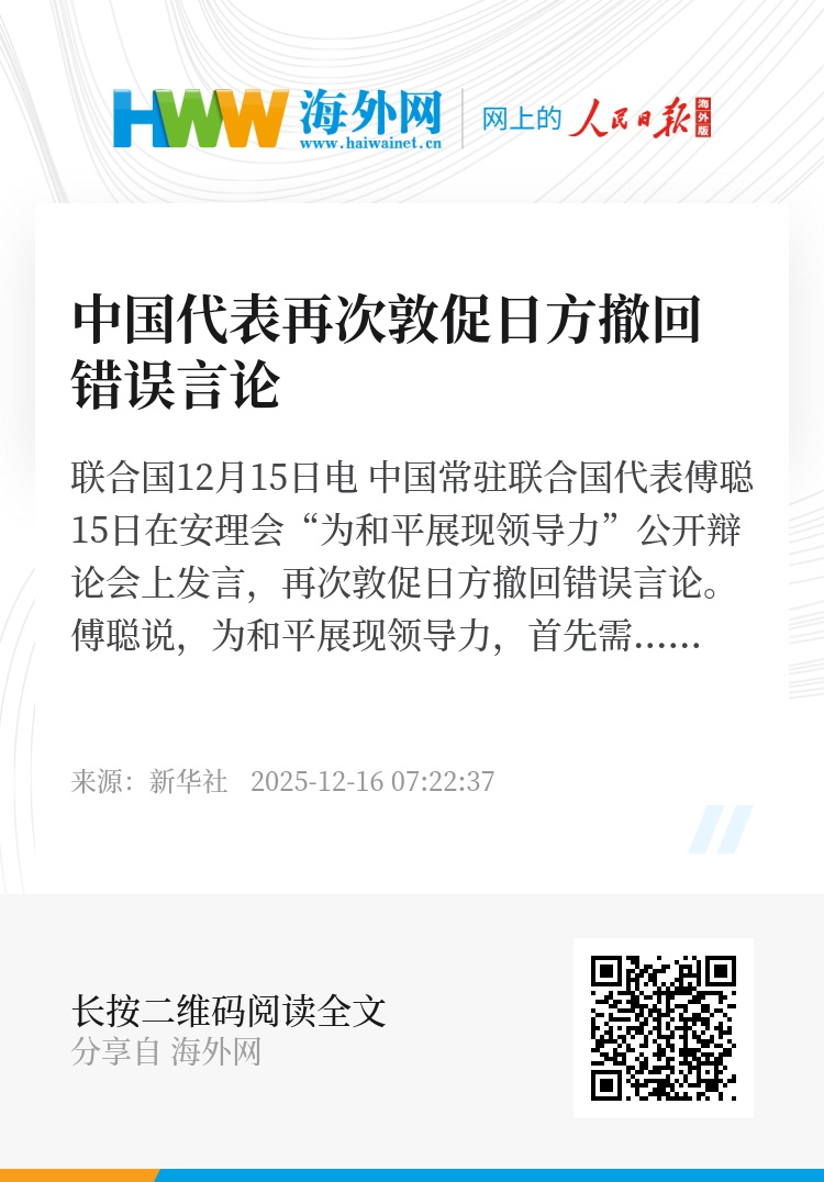 新华社联合国12月15日电 中国常驻联合国代表傅聪15日在安理会“为和平展现领导力”公开辩论会上发言,再次敦促日方撤回错误言论。