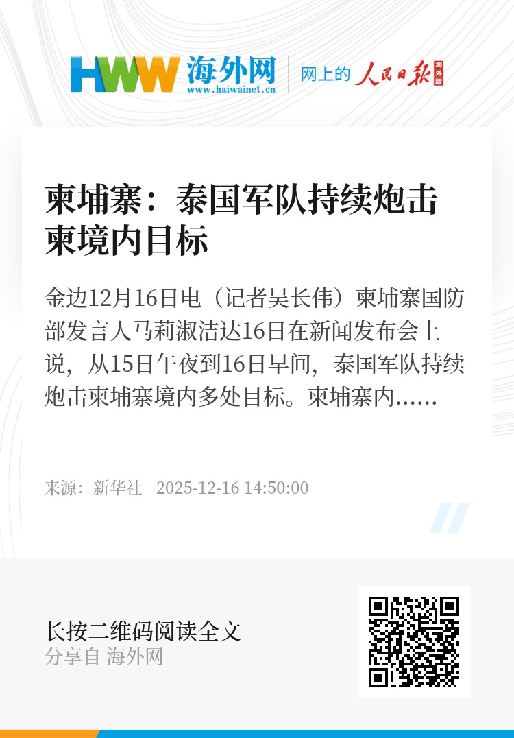 新华社金边12月16日电(记者吴长伟)柬埔寨国防部发言人马莉淑洁达16日在新闻发布会上说,从15日午夜到16日早间,泰国军队持续炮击柬埔寨境内多处目标。