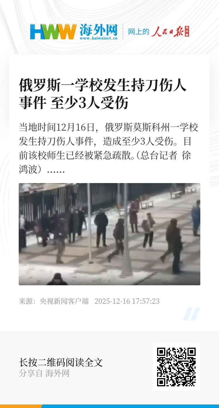 当地时间12月16日,俄罗斯莫斯科州一学校发生持刀伤人事件,造成至少3人受伤。目前该校师生已经被紧急疏散。(总台记者 徐鸿波)