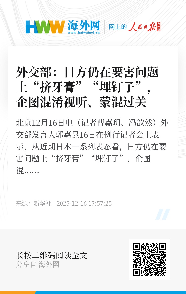 新华社北京12月16日电(记者曹嘉玥、冯歆然)外交部发言人郭嘉昆16日在例行记者会上表示,从近期日本一系列表态看,日方仍在要害问题上“挤牙膏”“埋钉子”,企图混淆视听、蒙混过关,中方对此坚决反对。