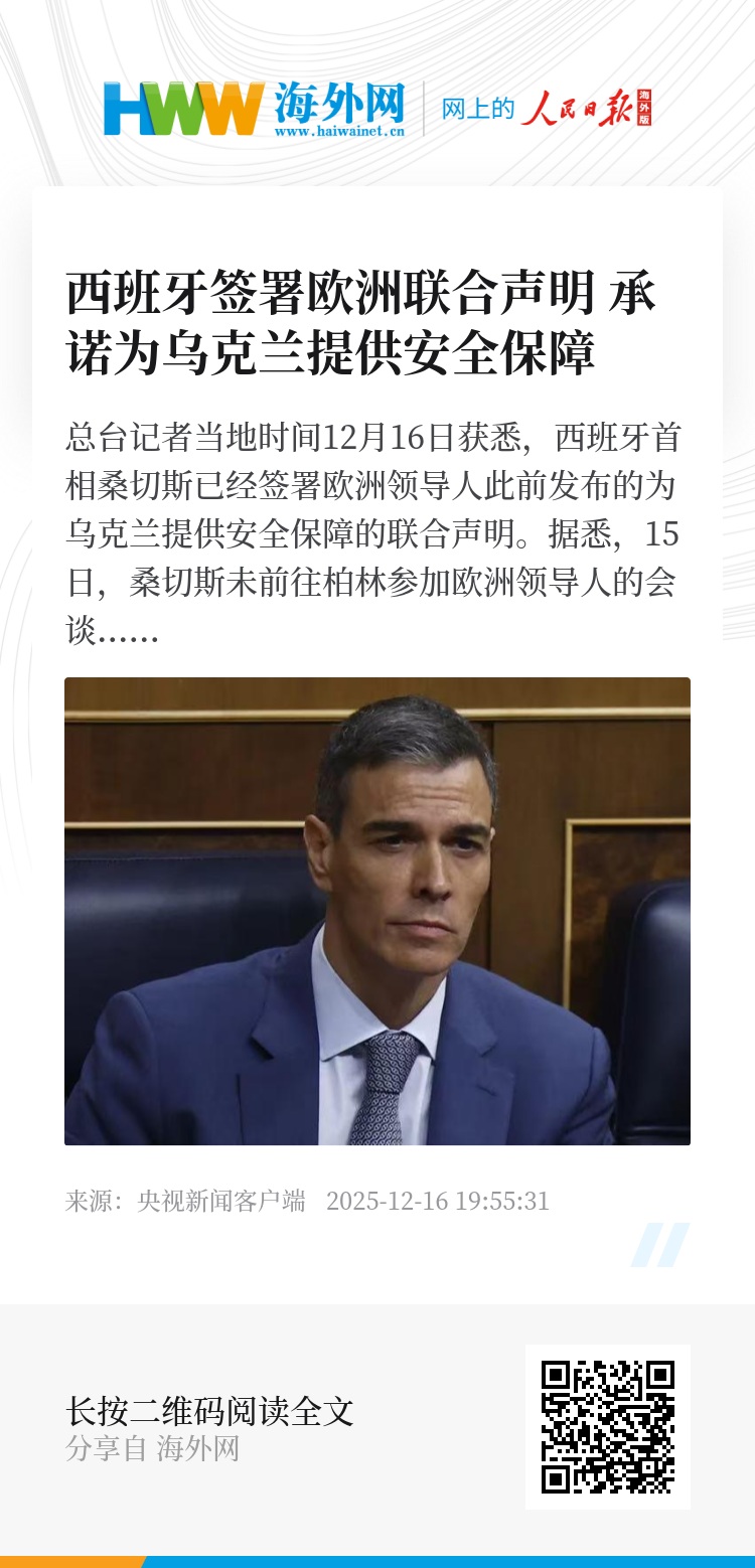 总台记者当地时间12月16日获悉,西班牙首相桑切斯已经签署欧洲领导人此前发布的为乌克兰提供安全保障的联合声明。