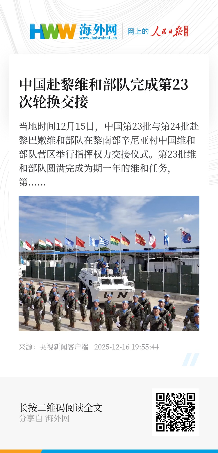 当地时间12月15日,中国第23批与第24批赴黎巴嫩维和部队在黎南部辛尼亚村中国维和部队营区举行指挥权力交接仪式。第23批维和部队圆满完成为期一年的维和任务,第24批维和部队正式接过维和神圣使命,这也是中国赴黎维和以来的第23次轮换。