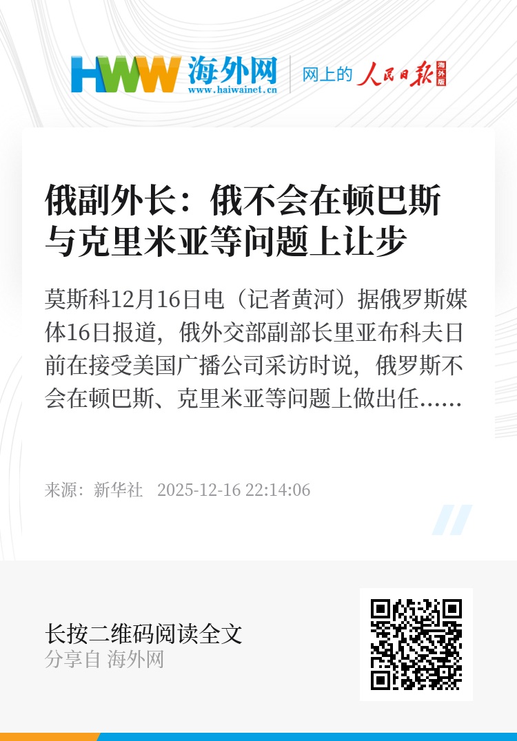 新华社莫斯科12月16日电(记者黄河)据俄罗斯媒体16日报道,俄外交部副部长里亚布科夫日前在接受美国广播公司采访时说,俄罗斯不会在顿巴斯、克里米亚等问题上做出任何让步,相关问题不在讨论范围内。