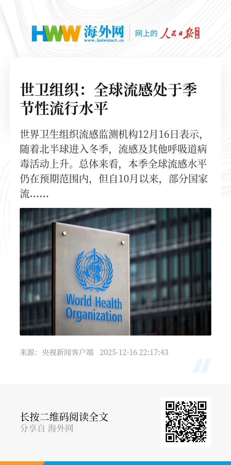 世界卫生组织流感监测机构12月16日表示,随着北半球进入冬季,流感及其他呼吸道病毒活动上升。总体来看,本季全球流感水平仍在预期范围内,但自10月以来,部分国家流感季提前启动并迅速达到流行水平,南半球一些国家则出现流感季延长的情况。