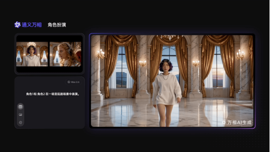 万相2.6是国内首个支持角色扮演功能的模型,能参考输入视频中的角色外观和音色、实现角色扮演,按照提示词生成单人、多人、人与物合拍的视频