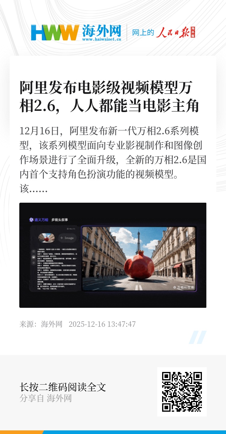 12月16日,阿里发布新一代万相2.6系列模型,该系列模型面向专业影视制作和图像创作场景进行了全面升级,全新的万相2.6是国内首个支持角色扮演功能的视频模型。该模型同时支持音画同步、多镜头生成及声音驱动等功能,是全球功能最全的视频生成模型。据了解,万相2.6已同步上线阿里云百炼、万相官网。