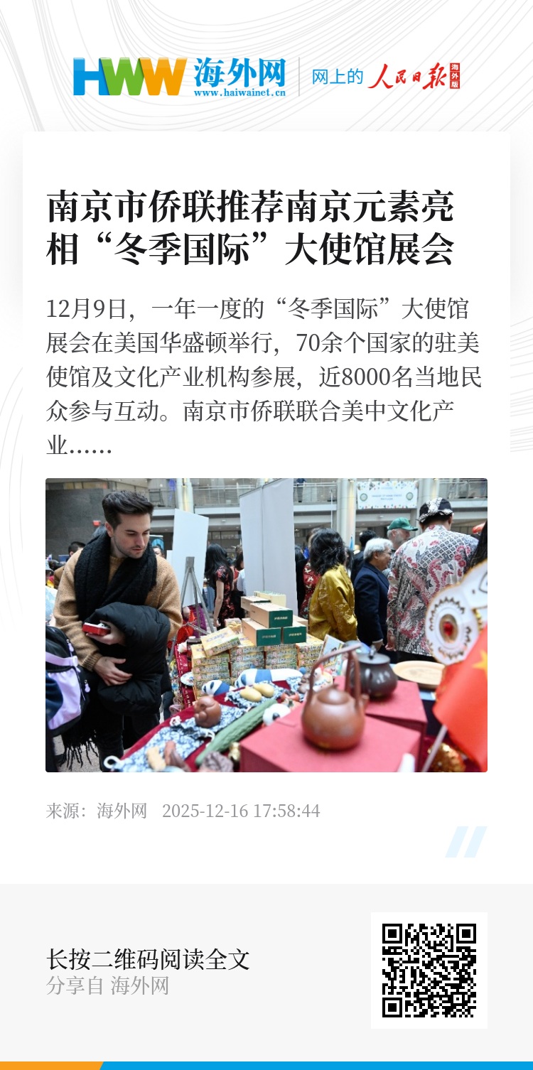 12月9日,一年一度的“冬季国际”大使馆展会在美国华盛顿举行,70余个国家的驻美使馆及文化产业机构参展,近8000名当地民众参与互动。南京市侨联联合美中文化产业协会、全美南京大学校友总会,成功推荐起源于南京的新中式糕点品牌“泸溪河”食品和非遗秦淮灯彩亮相中国驻美使馆“江苏时刻”主题展台,成为现场一道靓丽风景。