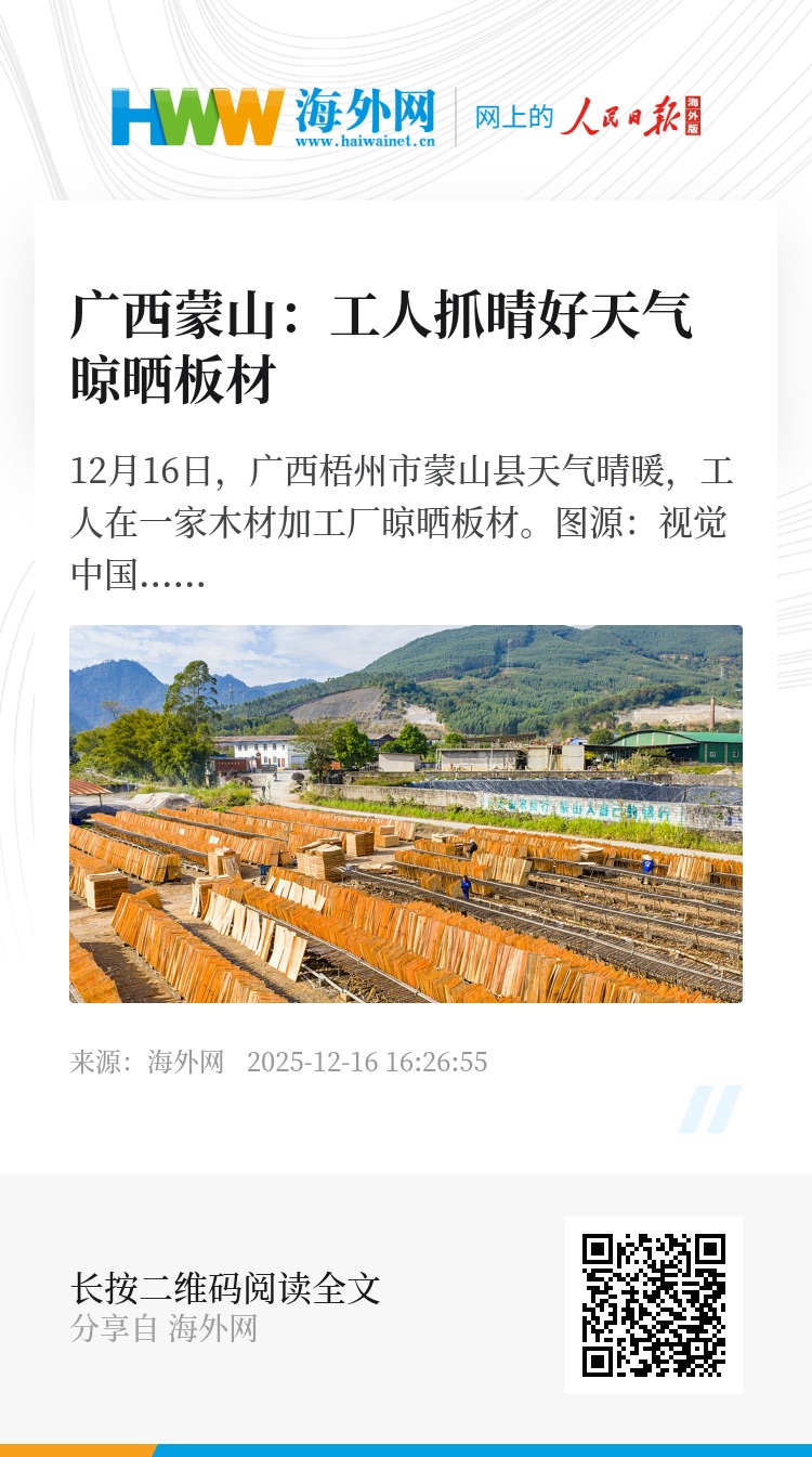 32916627,.广西蒙山:工人抓晴好天气晾晒板材,.2025-12-16 16:26:55,.204555,.陈菲扬、姚凯红