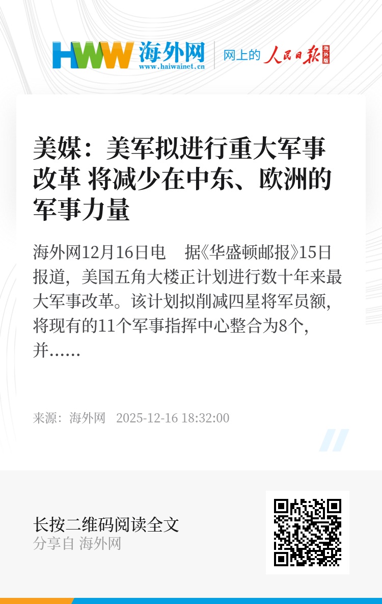 海外网12月16日电 据《华盛顿邮报》15日报道,美国五角大楼正计划进行数十年来最大军事改革。