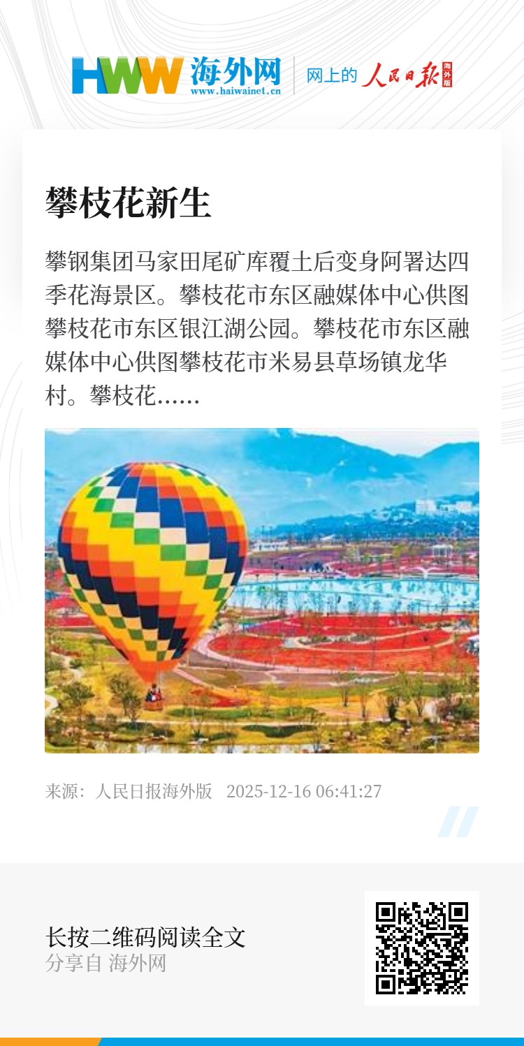 类似的嬗变在攀枝花市多处上演:徐家沟铁矿排土场通过生态修复变成了绿色田园;马家田尾矿库经过治理成为网红花海;佘家湾矿区架起光伏板,成为清洁能源基地……“生态修复+”模式让废弃矿区获得“二次生长”。