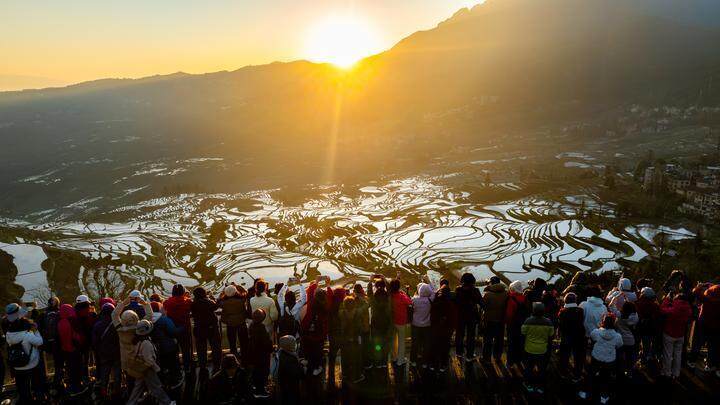 2025年2月27日,游客在红河州元阳县多依树景区看日出(无人机照片)。