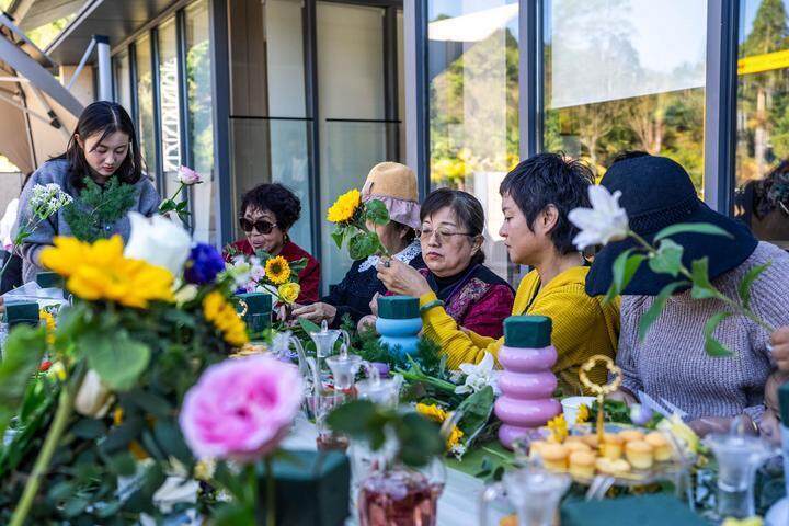 2025年11月29日,在普洱市思茅区旅居的老人们参加小区的插花活动。