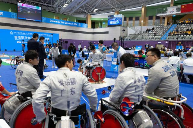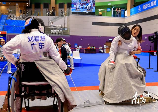 10日,轮椅击剑项目女子个人重剑C级金牌战打响。虽然是一场“广东德比”之战,广东省轮椅击剑队教练龙杰还是静静站在赛场边,盯着队员们的每一个动作。