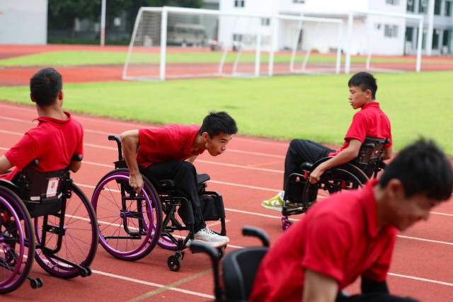 早上,队员们在操场刷圈,轮椅在跑道上向前转动,一圈又一圈。转入训练馆,队员们换上厚重的训练服,反复练习出击、躲闪等动作,汗水顺着脸颊不断滑落。