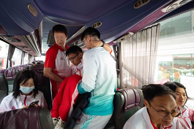出发前,助教张健忠将行动不便的队员们逐一抱上大巴。