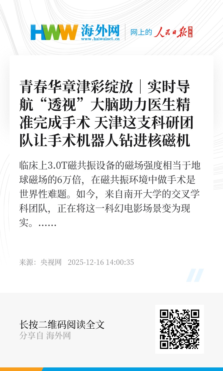 临床上3.0T磁共振设备的磁场强度相当于地球磁场的6万倍,在磁共振环境中做手术是世界性难题。如今,来自南开大学的交叉学科团队,正在将这一科幻电影场景变为现实。他们研发的“核磁兼容脑神经穿刺手术机器人”,能够在术中磁共振成像(iMRI)系统的实时导航下,操控手术器械以亚毫米级的精度,穿越复杂脑组织,直达病灶所在。这意味着医生能在手术过程中借助实时的脑区“地图”,动态避开重要功能区和血管结构,让患者的治疗更彻底、损伤更小。在生命禁区上演的这场的“舞蹈”中,每一毫米的推进都关乎着生命……