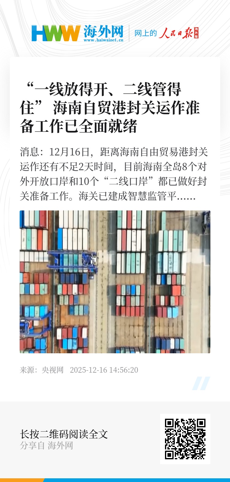 央视网消息:12月16日,距离海南自由贸易港封关运作还有不足2天时间,目前海南全岛8个对外开放口岸和10个“二线口岸”都已做好封关准备工作。海关已建成智慧监管平台及风险预警模型,对需经“二线口岸”监管的货物实施精准管理。