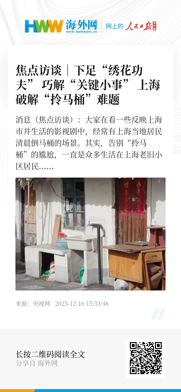 央视网消息(焦点访谈):大家在看一些反映上海市井生活的影视剧中,经常有上海当地居民清晨倒马桶的场景。其实,告别“拎马桶”的尴尬,一直是众多生活在上海老旧小区居民的期盼。为了解决这一困扰居民多年的痛点,政府接续努力,继2022年完成了成片旧改历史性任务、解决了集中成片的“拎马桶”问题后,经过两年的攻坚拔点,9月底,上海“拎马桶”改造任务总体完成。老旧小区如厕难,究竟难在了哪儿?上海又是怎么破解这个难题的呢?
