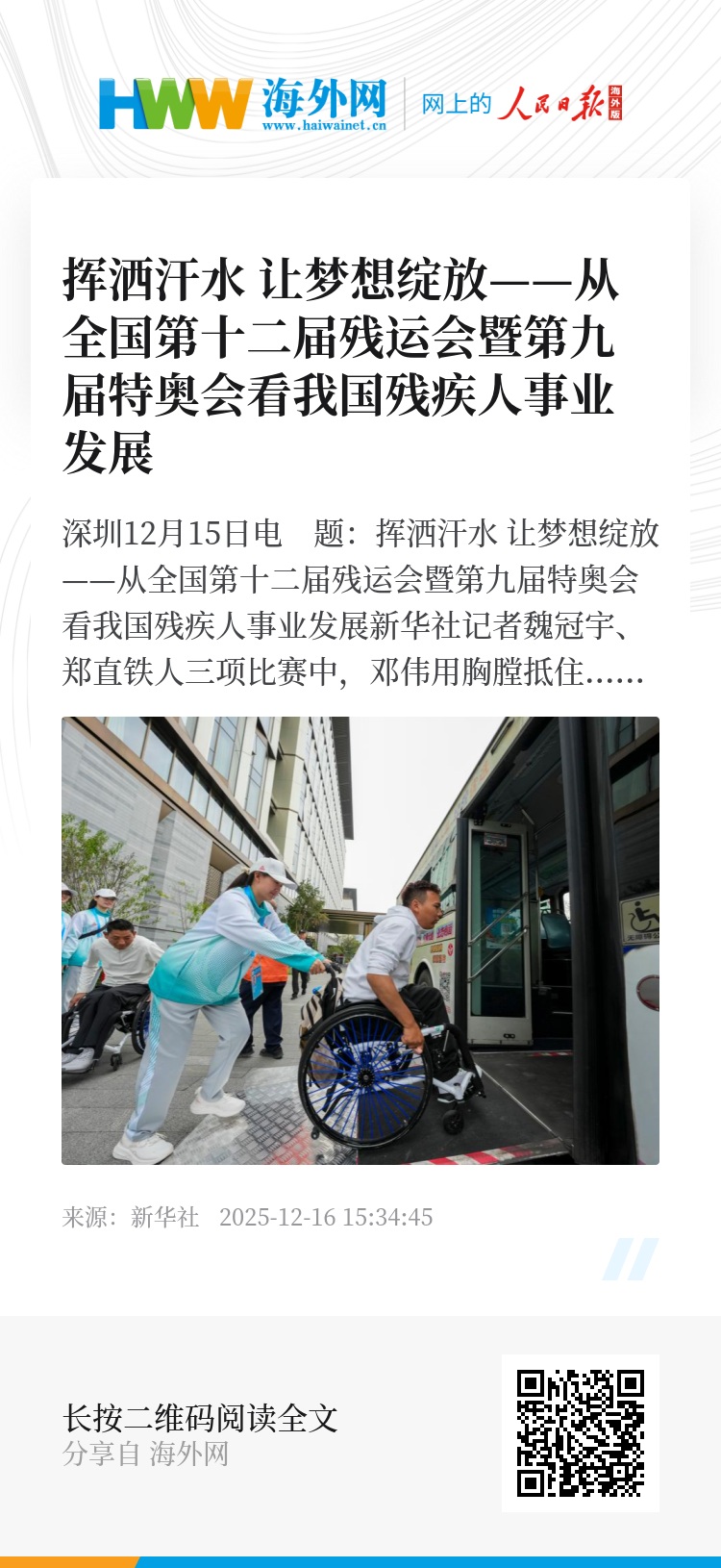 新华社深圳12月15日电 题:挥洒汗水 让梦想绽放——从全国第十二届残运会暨第九届特奥会看我国残疾人事业发展