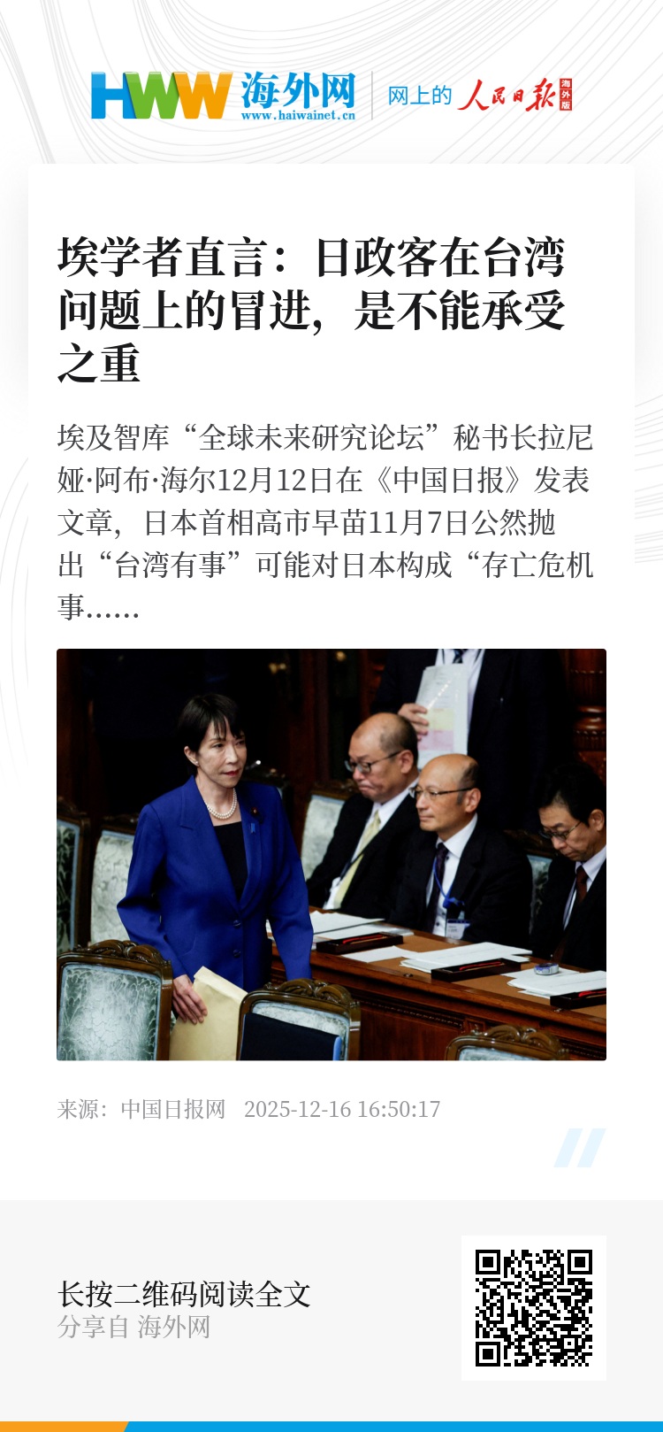 埃及智库“全球未来研究论坛”秘书长拉尼娅·阿布·海尔12月12日在《中国日报》发表文章,日本首相高市早苗11月7日公然抛出“台湾有事”可能对日本构成“存亡危机事态”的挑衅错误言论,迅速引发地区紧张局势升级,日本政坛的右翼倾向令人担心。