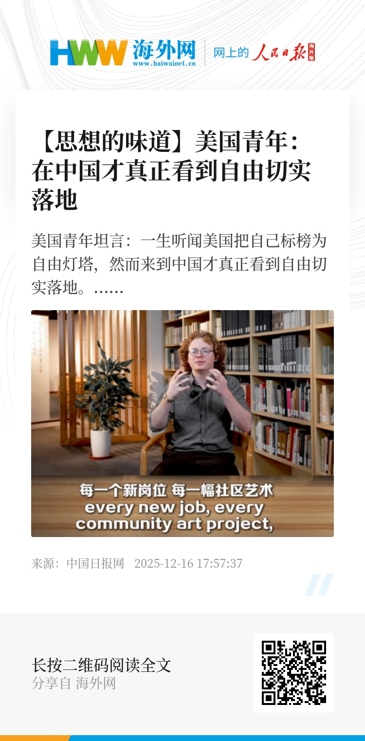 美国青年坦言:一生听闻美国把自己标榜为自由灯塔,然而来到中国才真正看到自由切实落地。