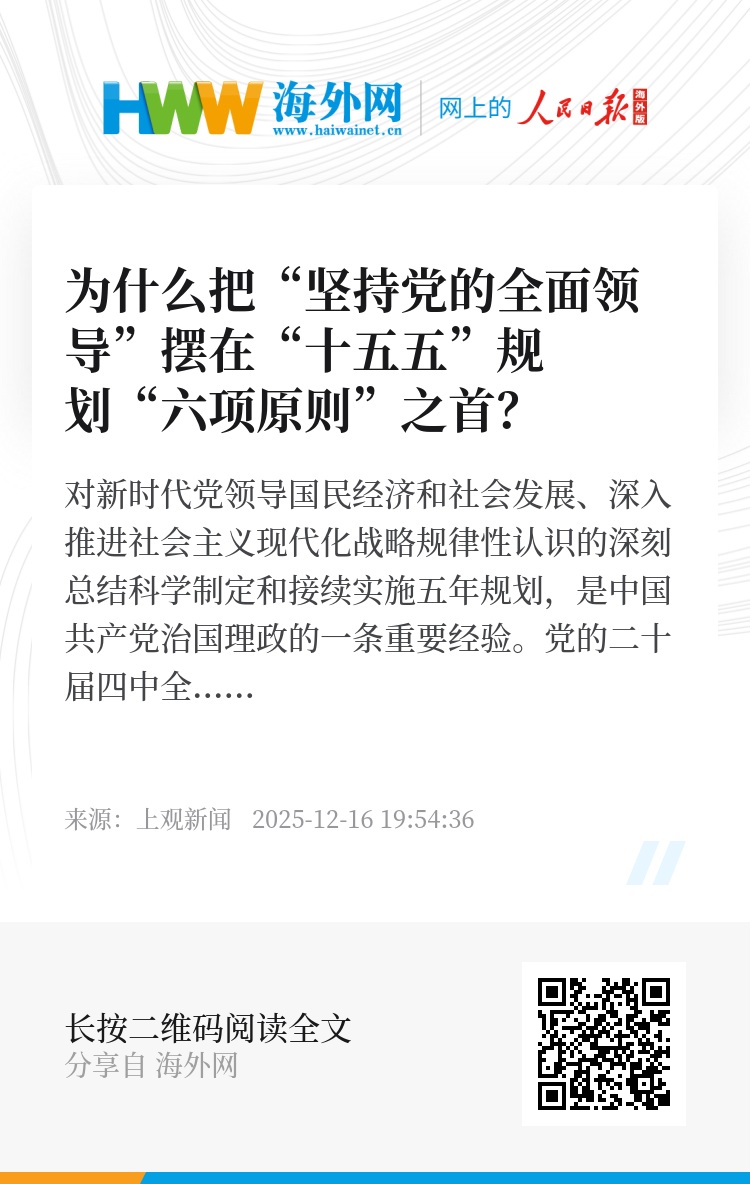 科学制定和接续实施五年规划,是中国共产党治国理政的一条重要经验。党的二十届四中全会把“坚持党的全面领导”摆在“十五五”时期经济社会发展必须遵循的“六项原则”之首。这是对新时代党领导国民经济和社会发展、深入推进社会主义现代化战略规律性认识的深刻总结。
