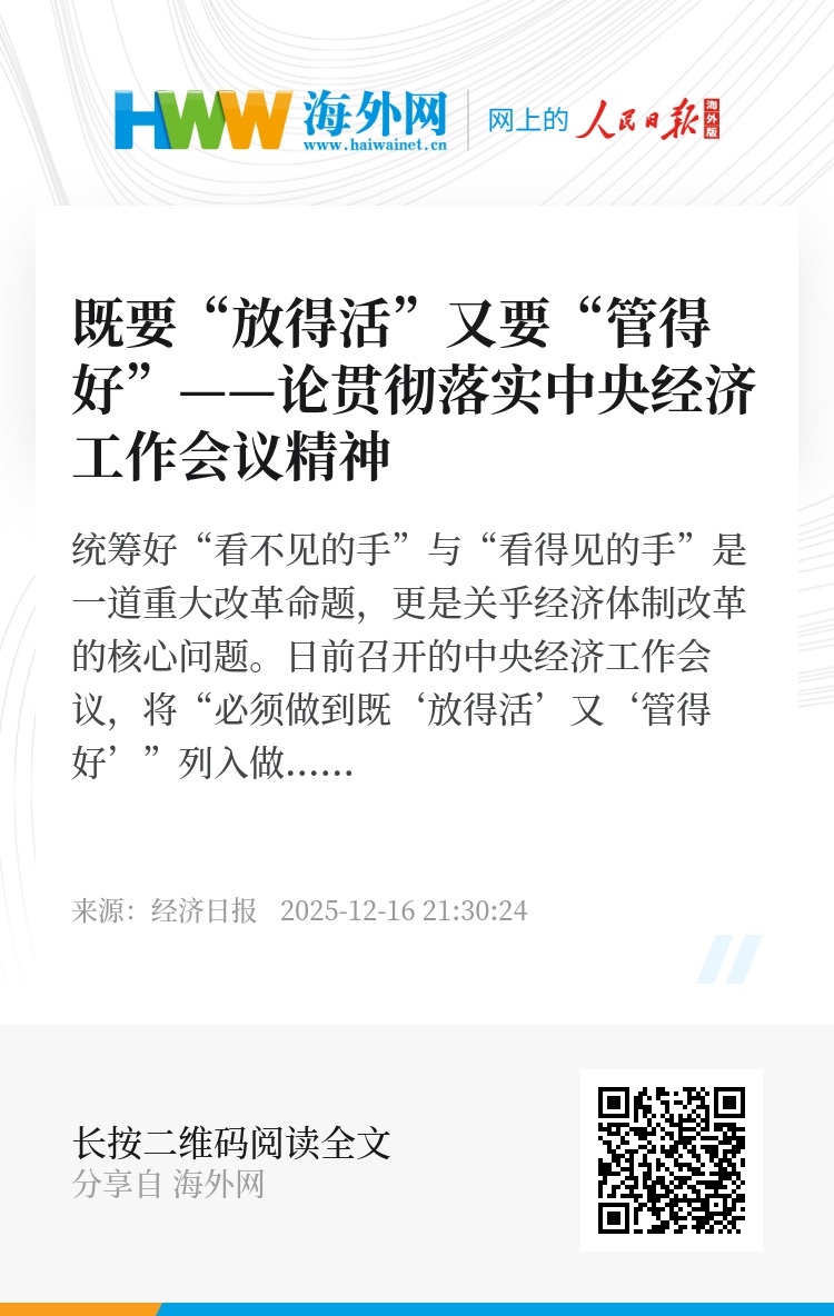 与去年中央经济工作会议相比,今年会议将“管得住”改为“管得好”,一字之变,蕴含着更高要求。面对快速涌现的新行业、新模式,如果政府看不懂、弄不清,自然无法“管得好”,更难以“放得活”。这就要求政府不断提高对市场的理解与认识,提升宏观经济治理能力。把握好“放”与“管”的平衡,放而有度、管而有序,“看不见的手”和“看得见的手”才能密切结合,共同弹好我国经济高质量发展的协奏曲。(本文来源:经济日报 作者:经济日报评论员)