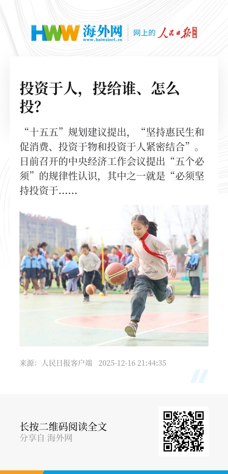 “十五五”规划建议提出,“坚持惠民生和促消费、投资于物和投资于人紧密结合”。日前召开的中央经济工作会议提出“五个必须”的规律性认识,其中之一就是“必须坚持投资于物和投资于人紧密结合”。