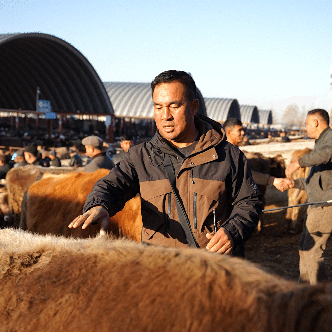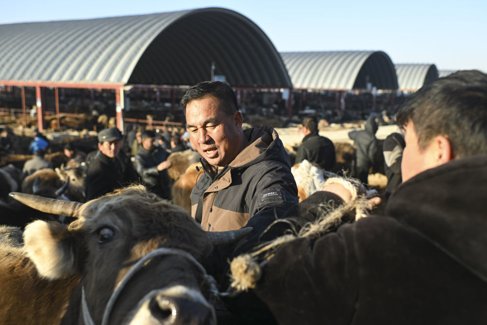 马军在新疆创锦黄公农产品交易市场为客户挑选牛。