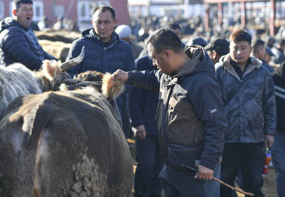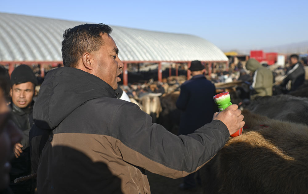 马军在新疆创锦黄公农产品交易市场为客户挑牛。