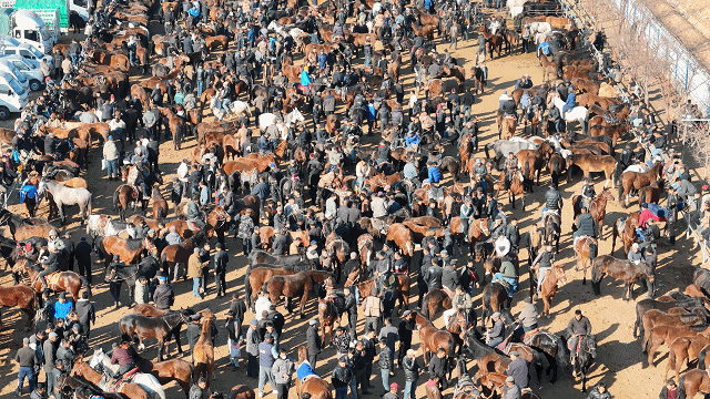 新疆创锦黄公农产品交易市场的马匹交易区(无人机照片)。