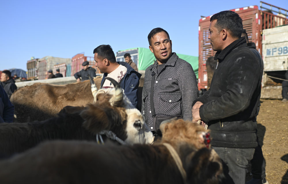 牲畜经纪人马军(中)带着来自青海的客户(左)在新疆创锦黄公农产品交易市场上选购牛。