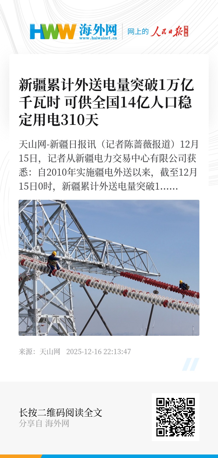 天山网-新疆日报讯(记者陈蔷薇报道)12月15日,记者从新疆电力交易中心有限公司获悉:自2010年实施疆电外送以来,截至12月15日0时,新疆累计外送电量突破1万亿千瓦时大关,达10005亿千瓦时。外送电力覆盖全国22个省区市,其中新能源外送占比近三成。这些外送电量,可供全国14亿人口稳定用电310天。
