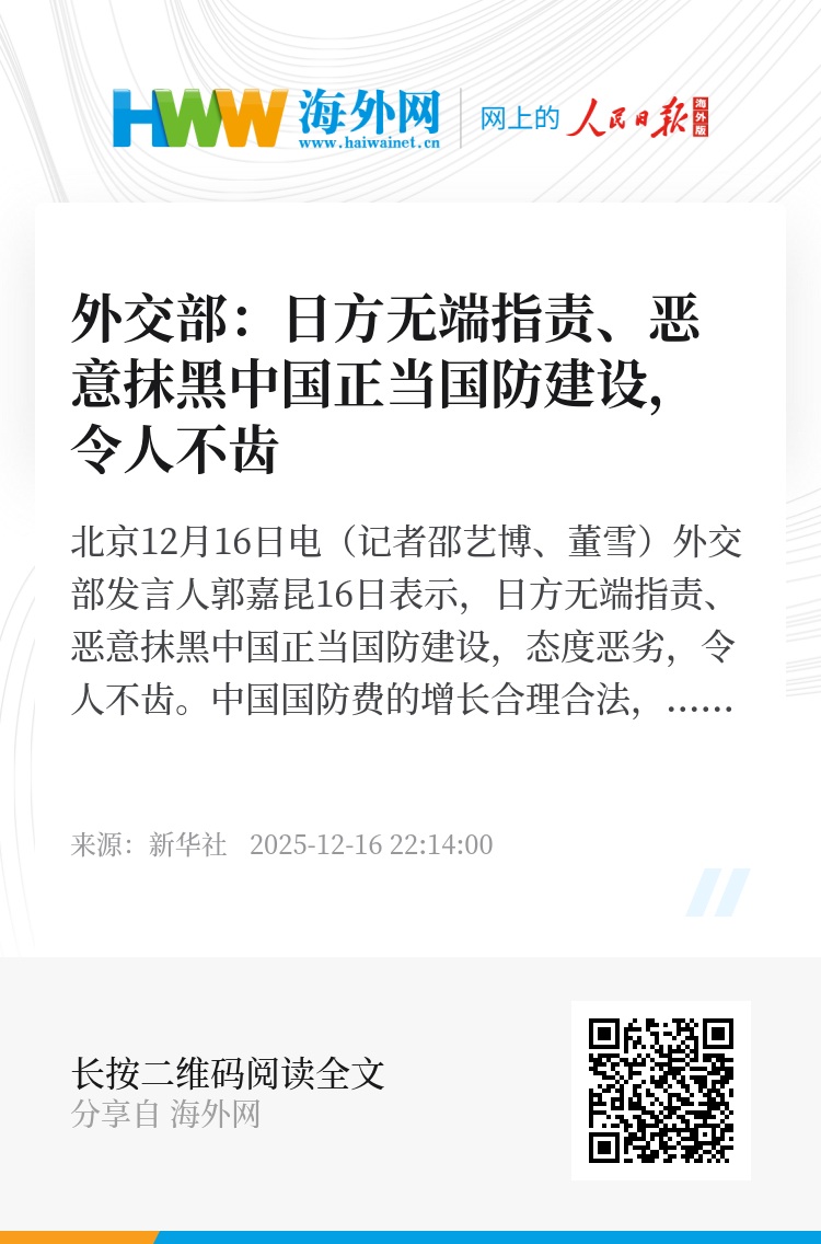 新华社北京12月16日电(记者邵艺博、董雪)外交部发言人郭嘉昆16日表示,日方无端指责、恶意抹黑中国正当国防建设,态度恶劣,令人不齿。中国国防费的增长合理合法,日方作为有严重侵略前科的国家,没有任何资格说三道四。