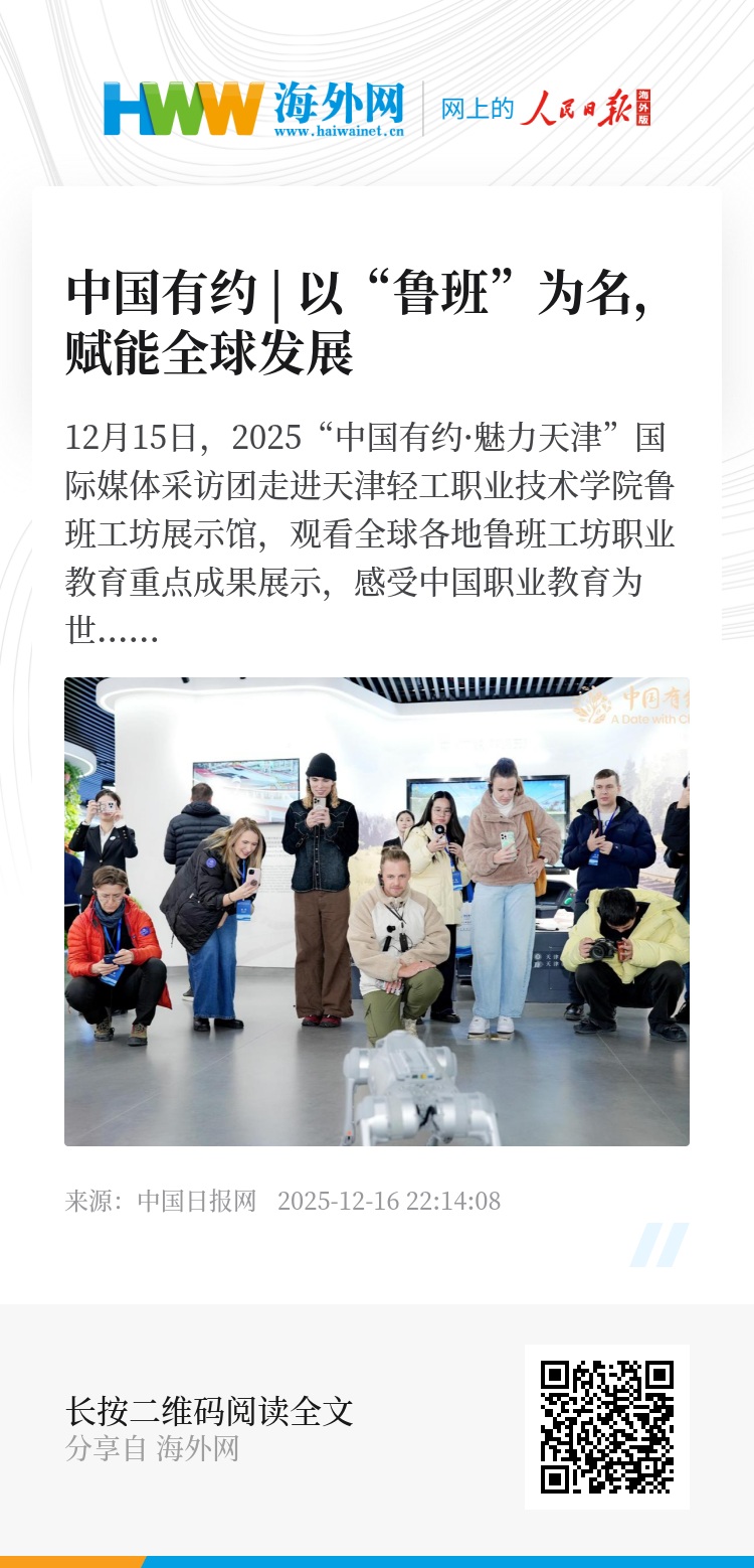 12月15日,2025“中国有约·魅力天津”国际媒体采访团走进天津轻工职业技术学院鲁班工坊展示馆,观看全球各地鲁班工坊职业教育重点成果展示,感受中国职业教育为世界培养技能人才的实践路径与丰硕成效。