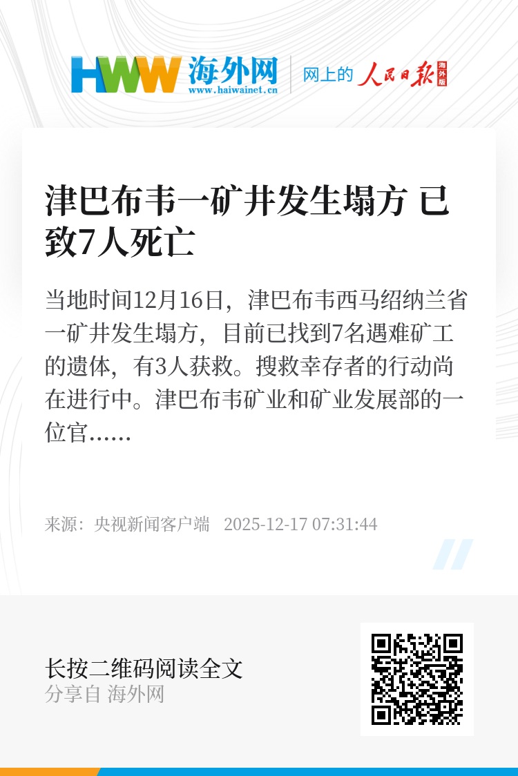 当地时间12月16日,津巴布韦西马绍纳兰省一矿井发生塌方,目前已找到7名遇难矿工的遗体,有3人获救。搜救幸存者的行动尚在进行中。