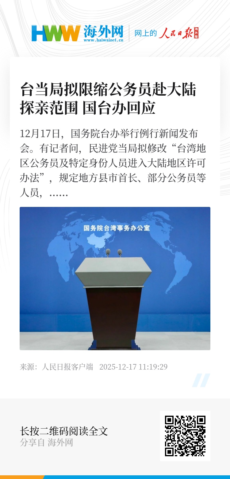 12月17日,国务院台办举行例行新闻发布会。有记者问,民进党当局拟修改“台湾地区公务员及特定身份人员进入大陆地区许可办法”,规定地方县市首长、部分公务员等人员,申请赴大陆探亲、奔丧亲属的亲等由四亲等内改为三亲等内;规范大部分公务员高阶主管与警官等赴大陆要提前7天申请。对此有何评论?