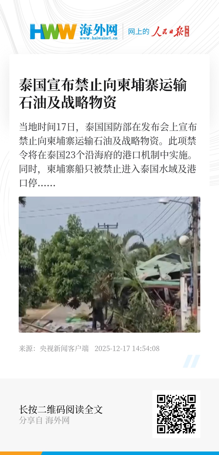 当地时间17日,泰国国防部在发布会上宣布禁止向柬埔寨运输石油及战略物资。此项禁令将在泰国23个沿海府的港口机制中实施。同时,柬埔寨船只被禁止进入泰国水域及港口停泊。