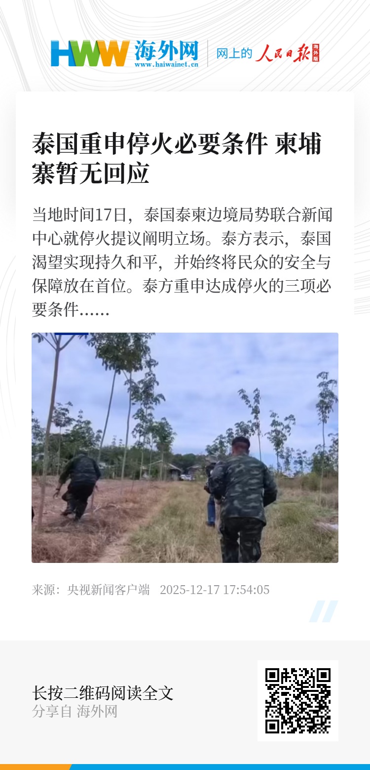 当地时间17日,泰国泰柬边境局势联合新闻中心就停火提议阐明立场。泰方表示,泰国渴望实现持久和平,并始终将民众的安全与保障放在首位。泰方重申达成停火的三项必要条件: