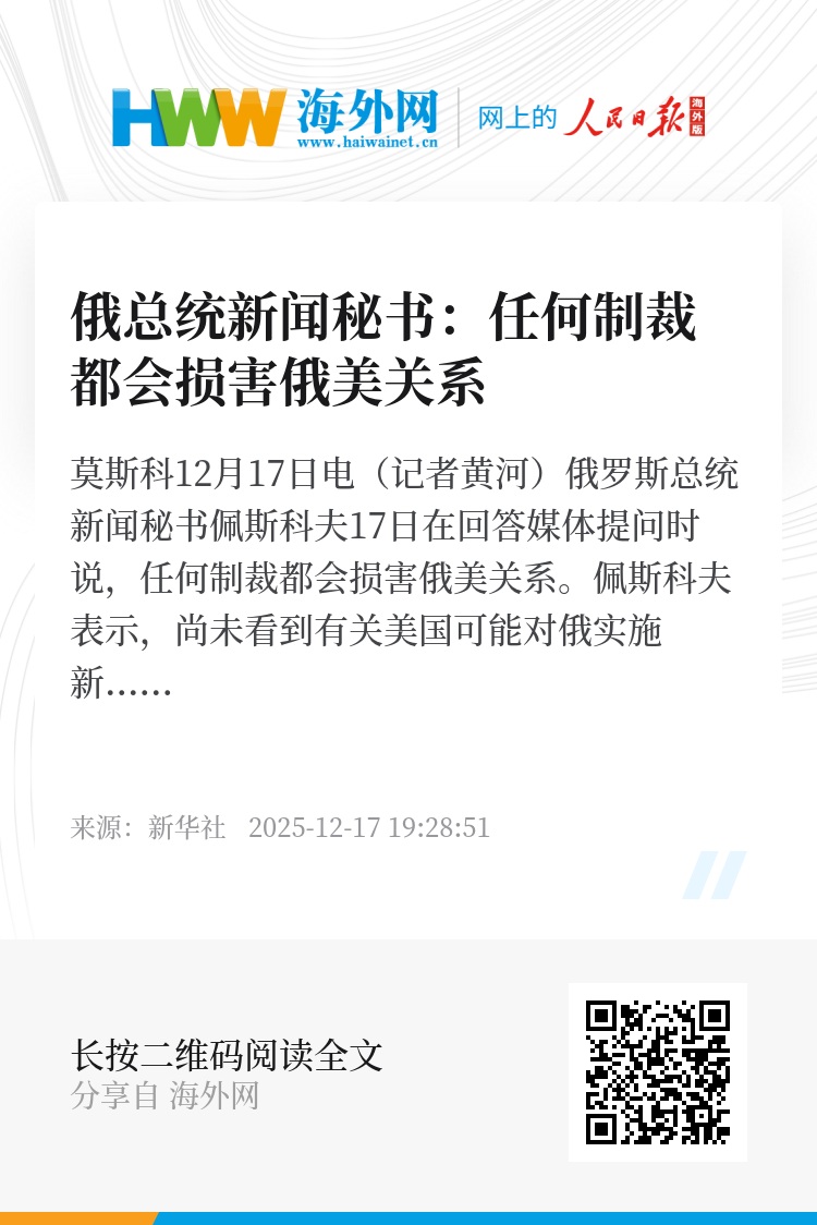 新华社莫斯科12月17日电(记者黄河)俄罗斯总统新闻秘书佩斯科夫17日在回答媒体提问时说,任何制裁都会损害俄美关系。