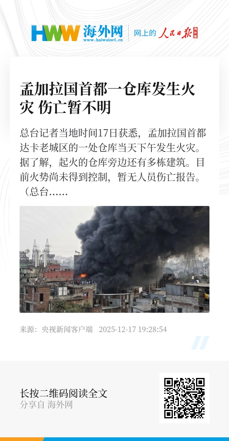 总台记者当地时间17日获悉,孟加拉国首都达卡老城区的一处仓库当天下午发生火灾。